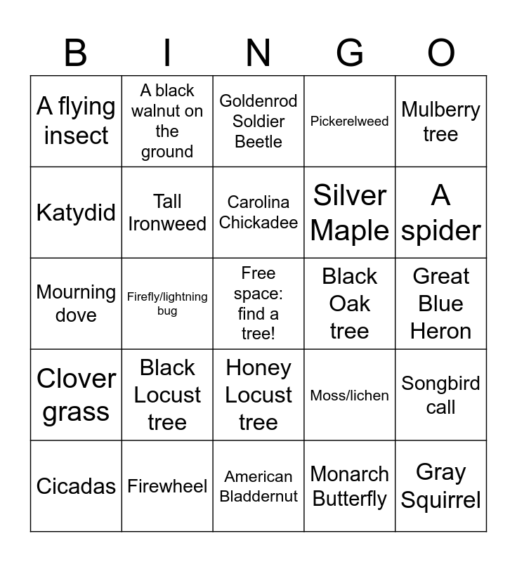 This bingo card has a free space and 44 words: Cormorant, Gray Squirrel, Turkey Vulture, Cicadas, Crickets, Monarch Butterfly, Goldenrod Soldier Beetle, American Pokeweed, Mulberry tree, Firewheel, Pickerelweed, Black Oak tree, Honey Locust tree, Black Locust tree, Virginia Creeper, American Bladdernut, Honeybee, Mourning dove, Eastern Redbud tree, A spider, A black walnut on the ground, American Sycamore tree, Dawn Redwood tree, A flying insect, Northern Cardinal, Great Blue Heron, Hackberry tree, A mushroom/fungus, Moss/lichen, Clover grass, A berry-like fruit, Songbird call, An acorn (on the ground or growing), Amur Honeysuckle, Firefly/lightning bug, American Crow, American Robin, Blue Jay, Carolina Chickadee, Katydid, Silver Maple, Wingstem (Verbesina alternifolia), Tall Ironweed and Tiger Swallowtail.