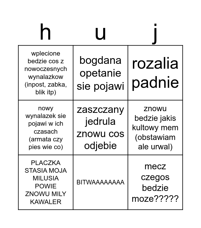 This bingo card has a free space and 8 words: znowu bedzie jakis kultowy mem (obstawiam ale urwal), rozalia padnie, bogdana opetanie sie pojawi, PLACZKA STASIA MOJA MILUSIA POWIE ZNOWU MILY KAWALER, wplecione bedzie cos z nowoczesnych wynalazkow (inpost, zabka, blik itp), mecz czegos bedzie moze?????, nowy wynalazek sie pojawi w ich czasach (armata czy pies wie co) and BITWAAAAAAAA.