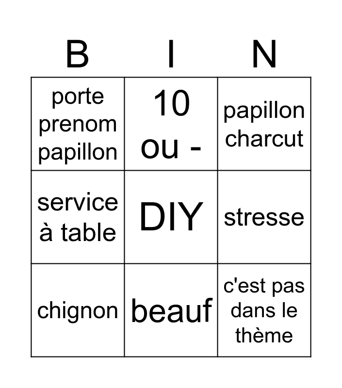 This bingo card has a free space and 8 words: stresse, papillon charcut, 10 ou -, chignon, porte prenom papillon, c'est pas dans le thème, service à table and beauf.