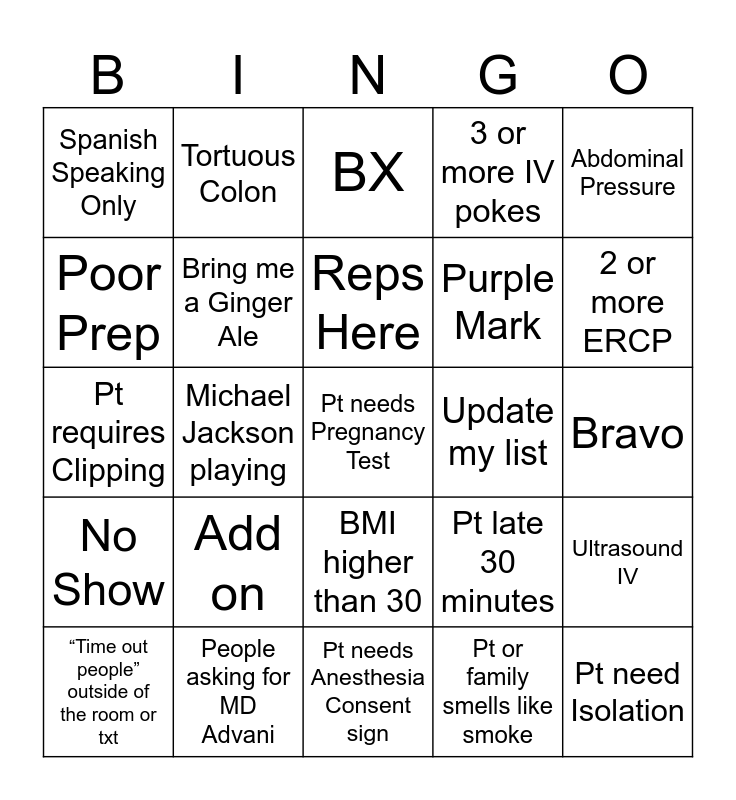 This bingo card has 25 words: Add on, Pt needs Anesthesia Consent sign, Reps Here, “Time out people” outside of the room or txt, Abdominal Pressure, Spanish Speaking Only, Poor Prep, Tortuous Colon, Update my list, BMI higher than 30, Purple Mark, Pt requires Clipping, Pt late 30 minutes, Ultrasound IV, Bring me a Ginger Ale, Pt need Isolation, Bravo, BX, 2 or more ERCP, Michael Jackson playing, Pt needs Pregnancy Test, People asking for MD Advani, No Show, 3 or more IV pokes and Pt or family smells like smoke.