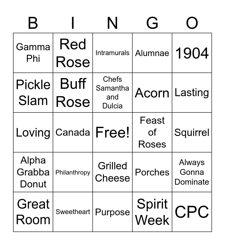 This bingo card has a free space and 40 words: Asparagus Plumosa Fern, Loving, Leading, Buff Rose, Sweetheart, Grilled Cheese, Chefs Samantha and Dulcia, Sisterhood, 1904, Alpha Grabba Donut, Canada, Alumnae, CPC, Squirrel, Feast of Roses, Philanthropy, Greek Week, Gamma Phi, Big/Little, Intramurals, Always Gonna Dominate, Spirit Week, Acorn, Pickle Slam, Syracuse, Pearl, Fighting Hunger, Meal Plan, Homecoming Week, Greek's Got Talent, Georgia (the dog), Great Room, Tug, Porches, Lasting, Purpose, Chums, External Relations Award, Red Rose and Banners.
