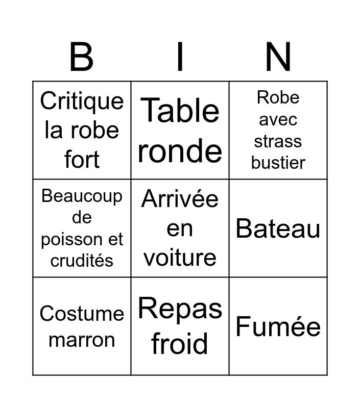 This bingo card has a free space and 8 words: Bateau, Robe avec strass bustier, Table ronde, Costume marron, Critique la robe fort, Fumée, Beaucoup de poisson et crudités and Repas froid.