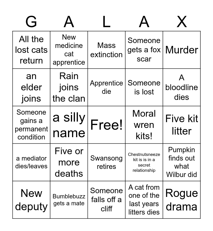 This bingo card has a free space and 24 words: New deputy, Five or more deaths, Apprentice die, A cat from one of the last years litters dies, Murder, All the lost cats return, New medicine cat apprentice, Mass extinction, Moral wren kits!, Five kit litter, Someone gains a permanent condition, Rain joins the clan, Chestnutsneeze kit is is in a secret relationship, Pumpkin finds out what Wilbur did, an elder joins, Bumblebuzz gets a mate, Someone falls off a cliff, Someone gets a fox scar, A bloodline dies, a mediator dies/leaves, a silly name, Swansong retires, Someone is lost and Rogue drama.