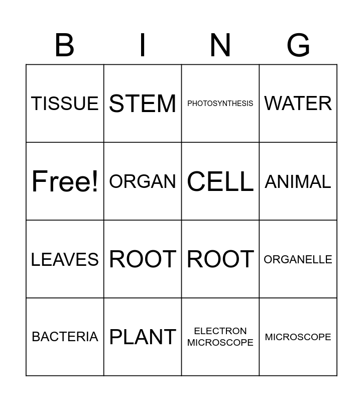 This bingo card has 16 words: PLANT, ORGANELLE, PHOTOSYNTHESIS, TISSUE, LEAVES, STEM, ROOT, ELECTRON MICROSCOPE, Free!, ORGAN, BACTERIA, WATER, ROOT, ANIMAL, CELL and MICROSCOPE.