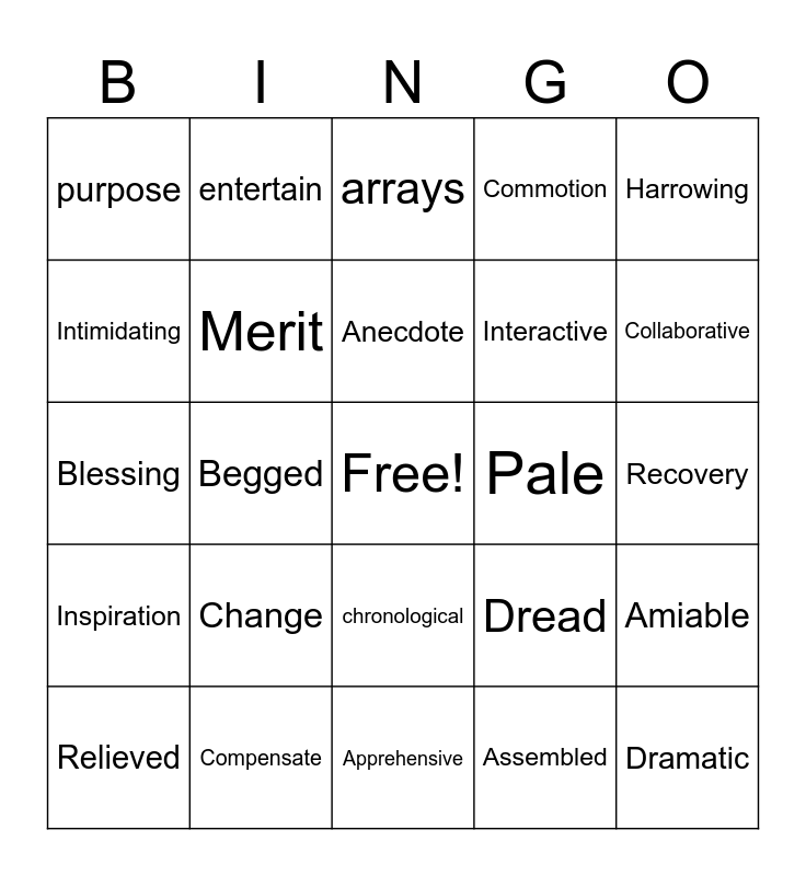 This bingo card has a free space and 99 words: synonyms, antonyms, strategies, arrays, outsmarts, behaviors, environment, materials, illustrators, details, characters, problem, creates, chronological, idioms, purpose, entertain, description, challenge, overcome, producers, consumers, earn, save, Agility, Amiable, Anecdote, Anguish, Anxiety, Applicable, Apprehensive, Assembled, Assets, Astonish, Begged, Blessing, Bolstered, Calamity, Celebration, Change, Chronically, Collaborative, Commotion, Compensate, Confined, Conscientious, Critical, Desperate, Devoted, Direction, Distant, Dramatic, Dread, Ego, Elated, Embarrassed, Emotional, Energetic, Enthusiasm, Epic, Forgive, Friction, Fury, Gratified, Habit, Harrowing, Help, Honor, Impact, Inspiration, Intense, Interactive, Intimidating, Lucrative, Mentorship, Mercy, Merit, Metaphor, Opportunity, Organize, Pale, Peace, Perception, Preoccupied, Prestigious, Proceeds, Protocol, Recharge, Recovery, Relieved, Resolution, Routine, Sacrifice, Skeptical, Stubborn, Succeed, Threatening, Thrive and Tumor.