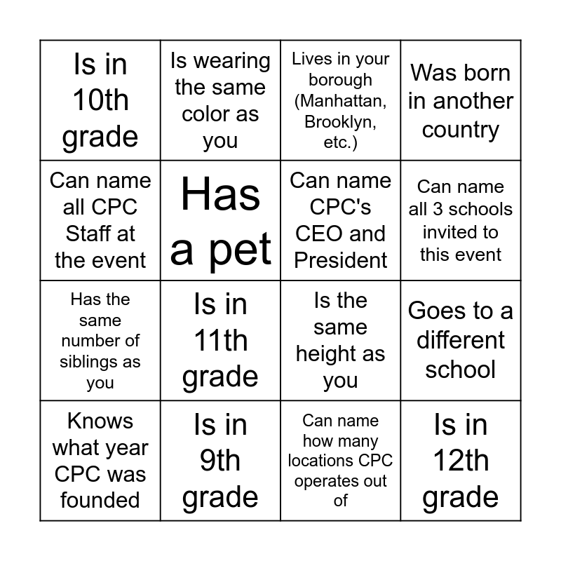 This bingo card has 16 words: Is in 9th grade, Goes to a different school, Lives in your borough (Manhattan, Brooklyn, etc.), Is in 10th grade, Has the same number of siblings as you, Is wearing the same color as you, Is the same height as you, Can name how many locations CPC operates out of, Can name all CPC Staff at the event, Has a pet, Knows what year CPC was founded, Was born in another country, Is in 11th grade, Can name all 3 schools invited to this event, Can name CPC's CEO and President and Is in 12th grade.