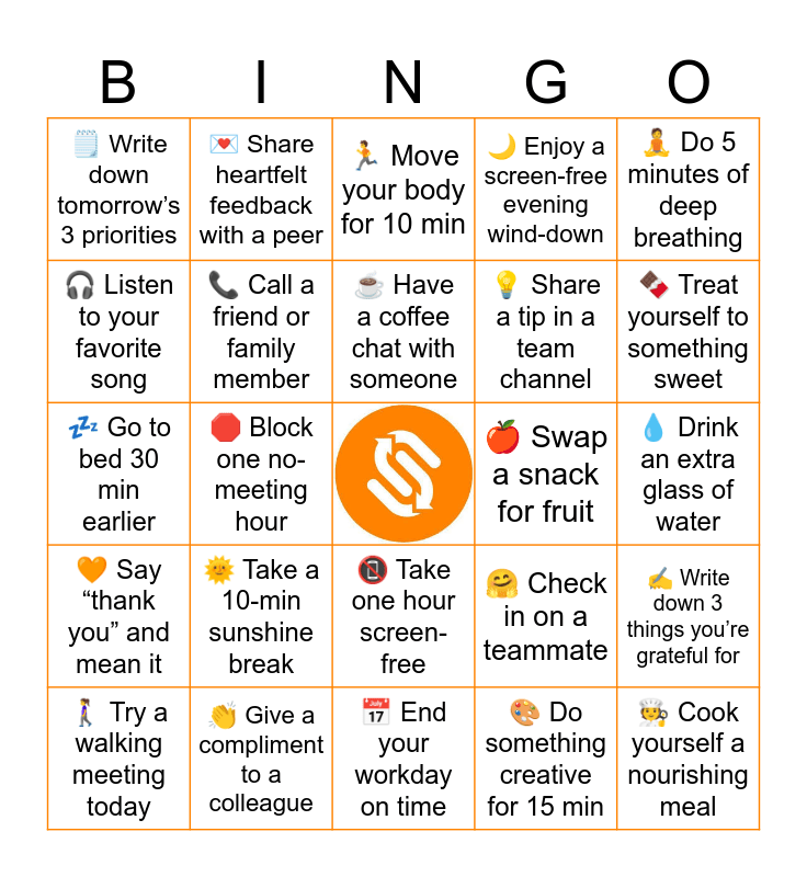 This bingo card has a free space and 24 words: π Take a 10-min sunshine break, π Give a compliment to a colleague, β Have a coffee chat with someone, πΆββοΈ Try a walking meeting today, π§ Do 5 minutes of deep breathing, ποΈ Write down tomorrowβs 3 priorities, π§ Listen to your favorite song, π Share heartfelt feedback with a peer, π Swap a snack for fruit, π΅ Take one hour screen-free, π‘ Share a tip in a team channel, π€ Go to bed 30 min earlier, π€ Check in on a teammate, βοΈ Write down 3 things youβre grateful for, π Call a friend or family member, π¨ Do something creative for 15 min, π§ Drink an extra glass of water, π Move your body for 10 min, π« Treat yourself to something sweet, π Block one no-meeting hour, π§βπ³ Cook yourself a nourishing meal, π§‘ Say βthank youβ and mean it, π Enjoy a screen-free evening wind-down and π End your workday on time.