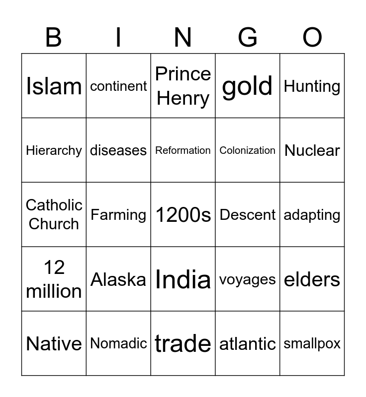 This bingo card has a free space and 24 words: Alaska, Nomadic, Reformation, Native, Hunting, Islam, Hierarchy, continent, Descent, India, Colonization, Catholic Church, voyages, elders, diseases, atlantic, adapting, Prince Henry, Nuclear, Farming, smallpox, 12 million, gold and trade.