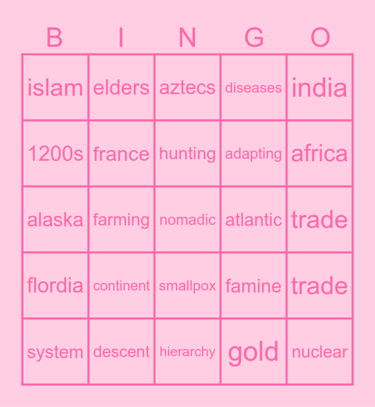 This bingo card has a free space and 24 words: continent, descent, hunting, system, india, islam, 1200s, elders, atlantic, smallpox, adapting, alaska, famine, trade, france, gold, trade, aztecs, africa, farming, nuclear, flordia, diseases and hierarchy.