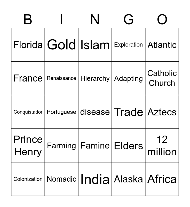 This bingo card has a free space and 24 words: Farming, Nomadic, Hierarchy, Colonization, Atlantic, Florida, France, Gold, Trade, Famine, Adapting, Conquistador, Elders, 12 million, Renaissance, Alaska, Aztecs, Islam, Catholic Church, Portuguese, Africa, Prince Henry, Exploration and India.