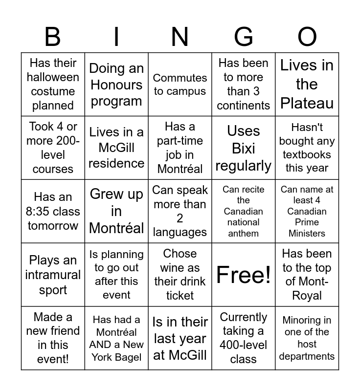 This bingo card has 25 words: Is planning to go out after this event, Is in their last year at McGill, Has a part-time job in Montréal, Made a new friend in this event!, Lives in the Plateau, Has their halloween costume planned, Took 4 or more 200-level courses, Doing an Honours program, Can recite the Canadian national anthem, Chose wine as their drink ticket, Uses Bixi regularly, Has an 8:35 class tomorrow, Free!, Has been to the top of Mont-Royal, Lives in a McGill residence, Minoring in one of the host departments, Can name at least 4 Canadian Prime Ministers, Commutes to campus, Hasn't bought any textbooks this year, Grew up in Montréal, Can speak more than 2 languages, Has had a Montréal AND a New York Bagel, Plays an intramural sport, Has been to more than 3 continents and Currently taking a 400-level class.