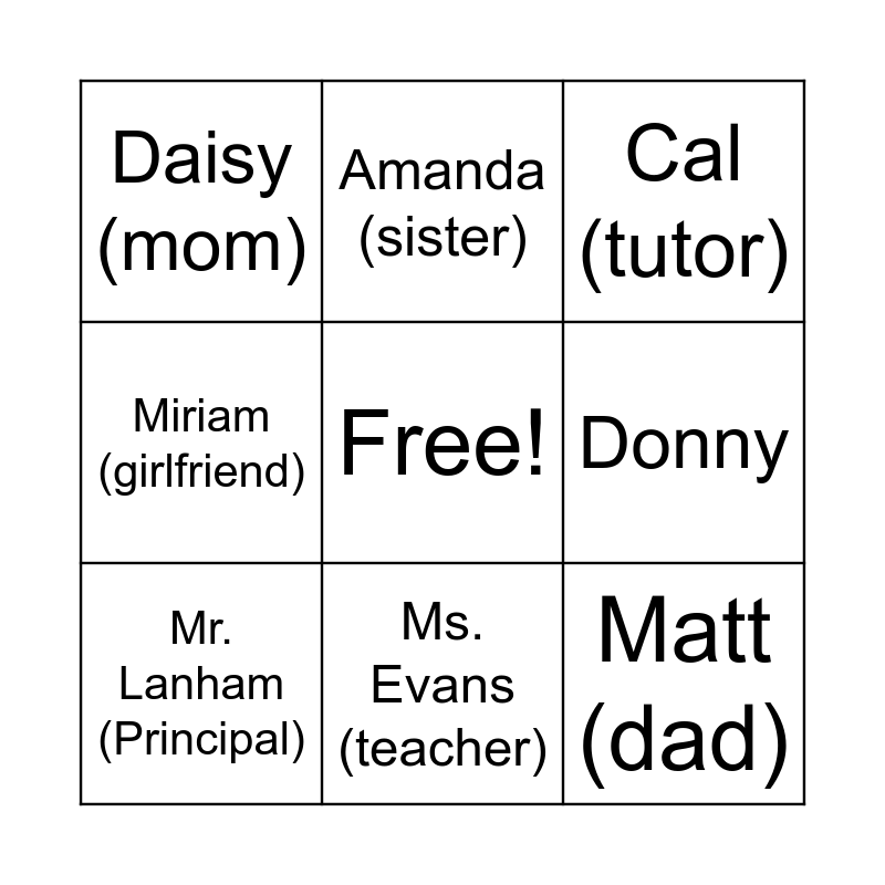 This bingo card has a free space and 8 words: Donny, Cal (tutor), Amanda (sister), Mr. Lanham (Principal), Daisy (mom), Matt (dad), Miriam (girlfriend) and Ms. Evans (teacher).