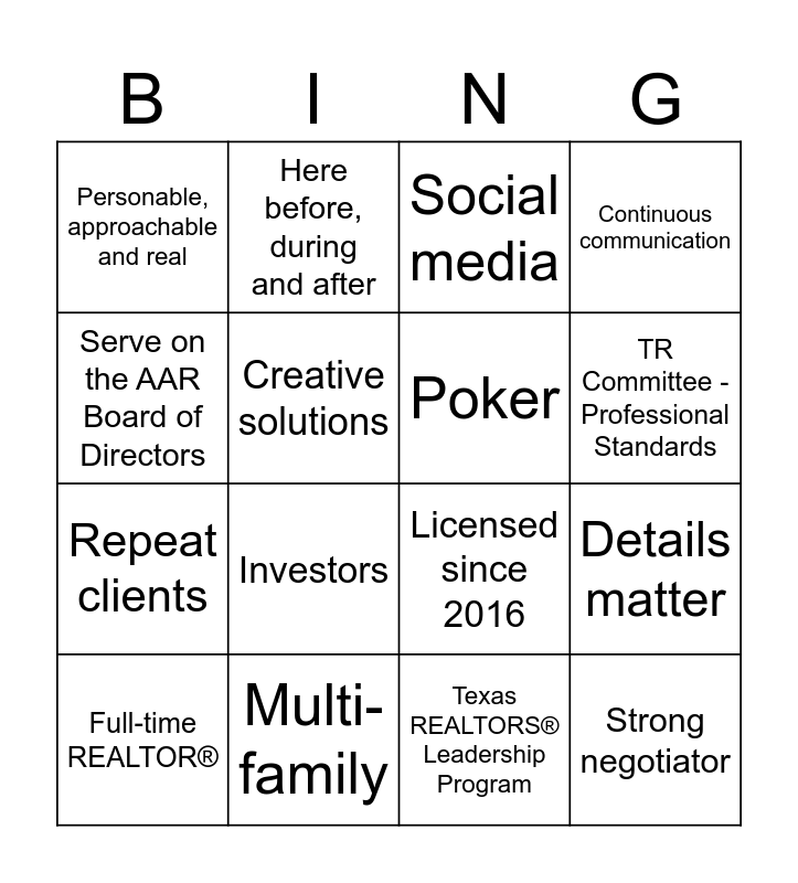 This bingo card has 41 words: Free!, Licensed since 2016, Over 325 transactions, Poker, Residential, Commercial, TR Committee - Professional Standards, TR Committee - Grassroots (Government), Serve on the AAR Board of Directors, Strong negotiator, Details matter, Continuous communication, Full-time REALTOR®, Texas REALTORS® Leadership Program, Multi-family, Confidentiality, Timelines, Personable, approachable and real, First-time homebuyers, Social media, Networking, Reputation, Top-producer, Repeat clients, Relocations, Growth mindset, Downsizing, Trusted advisor, Investors, Professional photos, Referrals, Here before, during and after, Confident, not confused, Market trends, Tech tools, Creative solutions, Real Estate Vision, Real Estate Victory, Honesty and Integrity, Advocate and Problem Solver.