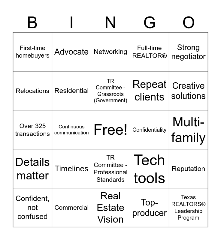 This bingo card has a free space and 40 words: Licensed since 2016, Over 325 transactions, Poker, Residential, Commercial, TR Committee - Professional Standards, TR Committee - Grassroots (Government), Serve on the AAR Board of Directors, Strong negotiator, Details matter, Continuous communication, Full-time REALTOR®, Texas REALTORS® Leadership Program, Multi-family, Confidentiality, Timelines, Personable, approachable and real, First-time homebuyers, Social media, Networking, Reputation, Top-producer, Repeat clients, Relocations, Growth mindset, Downsizing, Trusted advisor, Investors, Professional photos, Referrals, Here before, during and after, Confident, not confused, Market trends, Tech tools, Creative solutions, Real Estate Vision, Real Estate Victory, Honesty and Integrity, Advocate and Problem Solver.