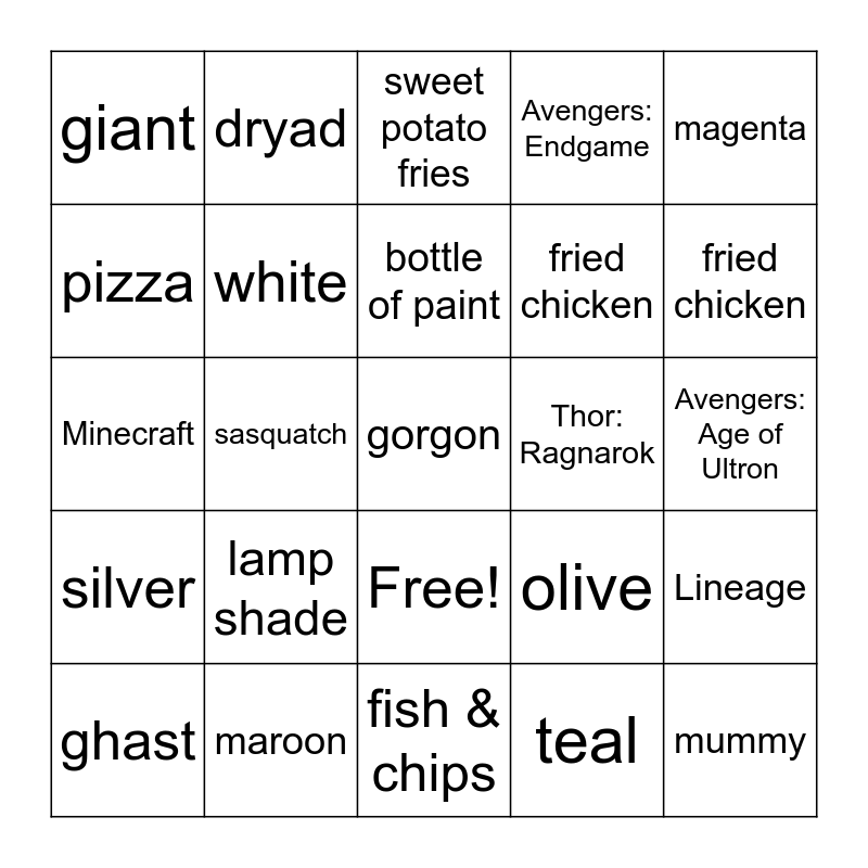 This bingo card has 26 words: Free!, teal, bottle of paint, maroon, magenta, giant, pizza, dryad, Avengers: Age of Ultron, olive, fried chicken, Minecraft, Lineage, ghast, sasquatch, doughnut, Avengers: Endgame, silver, sweet potato fries, gorgon, fried chicken, fish & chips, Thor: Ragnarok, lamp shade, white and mummy.