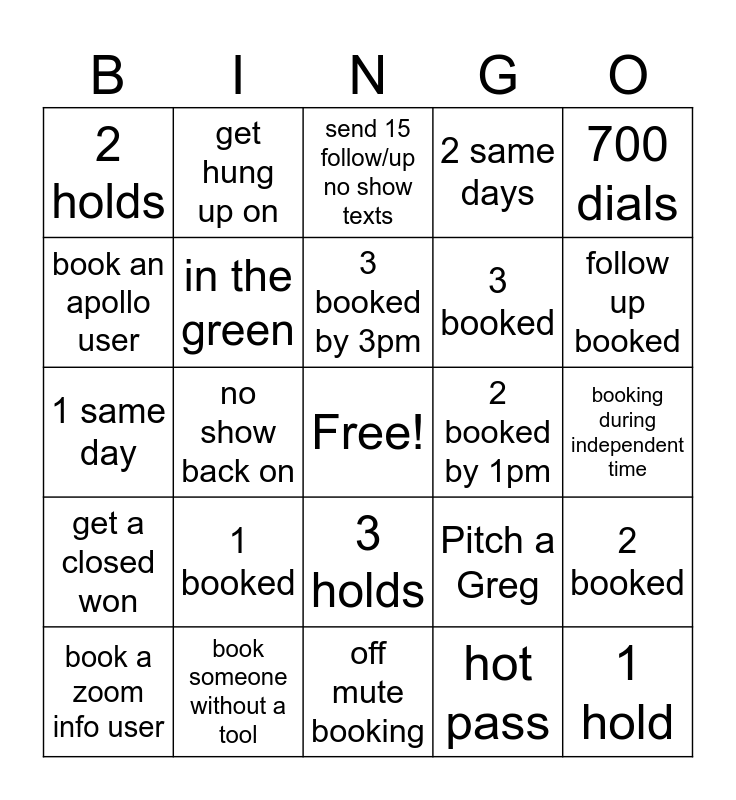 This bingo card has a free space and 24 words: 1 booked, book someone without a tool, 3 booked by 3pm, book a zoom info user, 700 dials, 2 holds, book an apollo user, get hung up on, 2 booked by 1pm, 3 holds, 3 booked, 1 same day, Pitch a Greg, 2 booked, in the green, hot pass, booking during independent time, send 15 follow/up no show texts, follow up booked, no show back on, 1 hold, get a closed won, 2 same days and off mute booking.