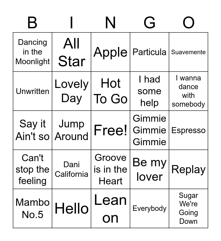 This bingo card has a free space and 34 words: September, Everybody, Let's Groove, Bad Blood, Can't stop the feeling, Lovely Day, Suavemente, Mambo No.5, All Star, Golden, Hot To Go, Apple, Wannabe, Hey Ya!, Gimmie Gimmie Gimmie, I wanna dance with somebody, Hello, Say it Ain't so, Dani California, Be my lover, Groove is in the Heart, Mr. Brightside, Dancing in the Moonlight, Espresso, Lean on, Sugar We're Going Down, Particula, Let me Live, I had some help, Unwritten, No Scrubs, Jump Around, Replay and Call me Maybe.