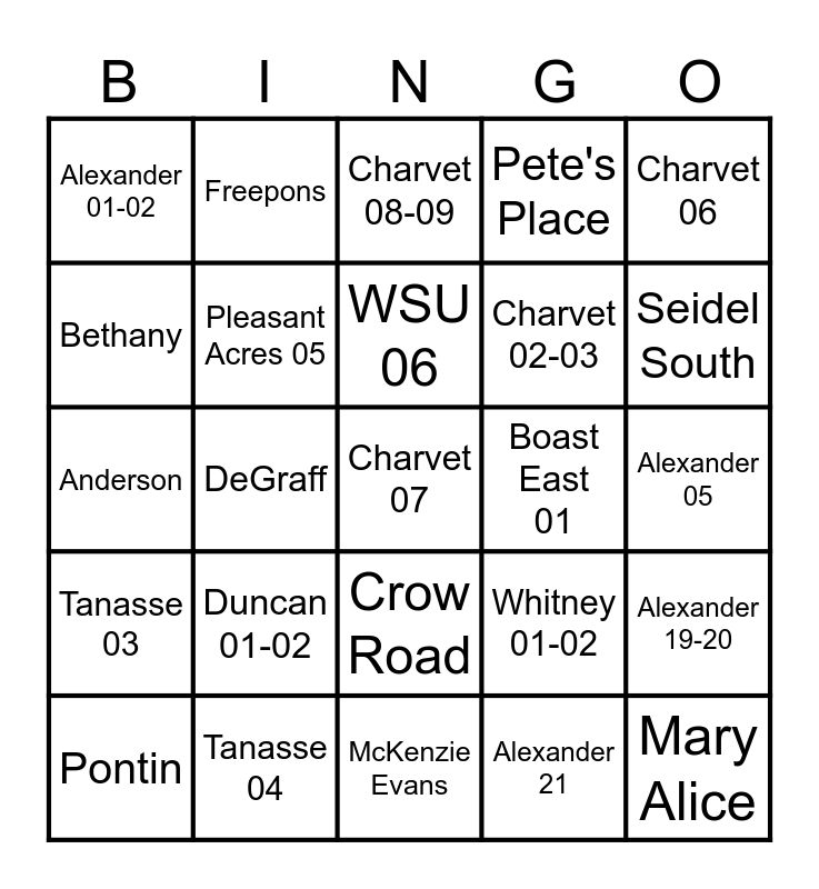 This bingo card has 70 words: Duncan S, Alexander 05, Miller 08-09, Parker N, Tanasse 04, WSU 02, Pete's Place, Goble 01-02, Charvet 06, McKenzie-Woodworth, Alexander 19-20, Tanasse 05, Alexander 01-02, Charvet 08-09, Pleasant Acres 07, DeGraff, Crow Road, Charvet 02-03, Ernie W 01-02, Tanasse 03, Boast East 01, Whitney 01-02, Seidel South, Swynenburg 13, McKenzie Griffin, Swynenburg 05, McCombs 02, Swynenburg 08-09, Alexander 21, Crosby 05-06, Freepons, Dufault S, Cardon 01-02, Swynenburg Feedlot, Vernon Brown S 02, Jacona 01-02-03, Vernon Brown S 01, Ernie W 03-04, McKenzie-Harrison, Bethany, Mary Alice, Duncan 01-02, Charvet 07, Antenna 01, Loges, Pleasant Acres 05, Pontin, Pleasant Acres 06, Charvet 05, Lewis Snipes 01, Maurice, McCombs 03, Kirby's Korner, Alexander 03, McKenzie Evans, Stillwell, WSU 06, Pleasant Acres 03, Yard 116-E, Johnson 01, Anderson, Swynenburg 06-07, Freepons W 01-02-03, Tanasse 01, Vernon Brown N 01-02, Boast East 02-03, Sorensen Mountain View, Ward, McCombs 01-04 and Swynenburg 11-12.