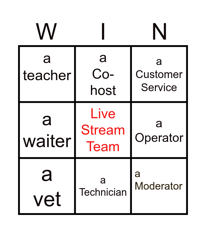 This bingo card has a free space and 12 words: a Host, a Planner, a Moderator, a Operator, a Co-host, a Customer Service, a Technician, a customer, a teacher, a waiter, a vet and a policeman.