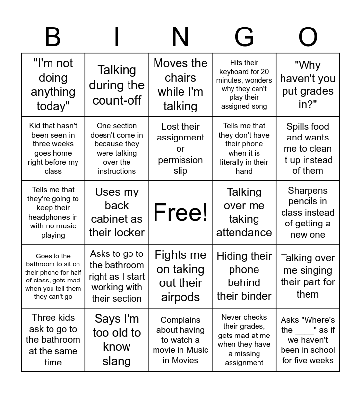 This bingo card has a free space and 24 words: Asks to go to the bathroom right as I start working with their section, Says I'm too old to know slang, Lost their assignment or permission slip, Three kids ask to go to the bathroom at the same time, "Why haven't you put grades in?", "I'm not doing anything today", Kid that hasn't been seen in three weeks goes home right before my class, Talking during the count-off, Talking over me taking attendance, Fights me on taking out their airpods, Tells me that they don't have their phone when it is literally in their hand, Tells me that they're going to keep their headphones in with no music playing, Hiding their phone behind their binder, Talking over me singing their part for them, One section doesn't come in because they were talking over the instructions, Never checks their grades, gets mad at me when they have a missing assignment, Sharpens pencils in class instead of getting a new one, Moves the chairs while I'm talking, Spills food and wants me to clean it up instead of them, Uses my back cabinet as their locker, Asks "Where's the ____" as if we haven't been in school for five weeks, Goes to the bathroom to sit on their phone for half of class, gets mad when you tell them they can't go, Hits their keyboard for 20 minutes, wonders why they can't play their assigned song and Complains about having to watch a movie in Music in Movies.