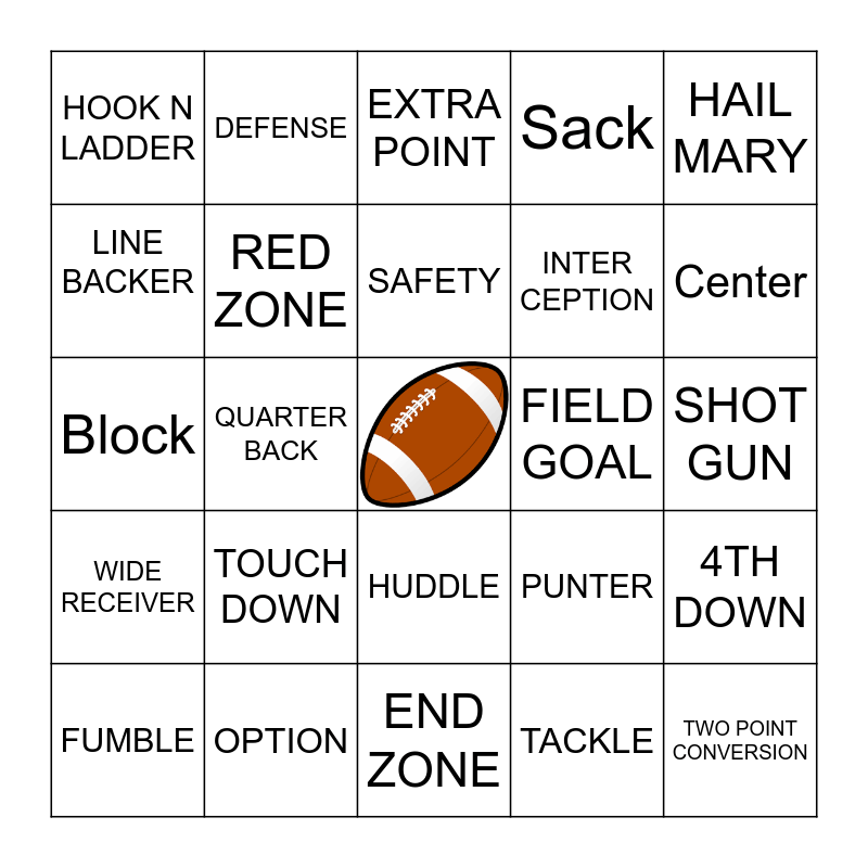 This bingo card has a free space and 39 words: TIGHT END, FIRST DOWN, RUNNING BACK, RED ZONE, FUMBLE, HUDDLE, SAFETY, KICKER, HAIL MARY, WIDE RECEIVER, QUARTER BACK, Sack, TWO POINT CONVERSION, SHOT GUN, FIELD GOAL, TOUCH DOWN, SWEEP, HOOK N LADDER, INSTANT REPLAY, PUNTER, LINE BACKER, END ZONE, INTER CEPTION, Center, PENALTY, RUSHING, Audible, OFF SIDES, SHOTGUN, DEFENSE, DRAW PLAY, OFFENSE, EXTRA POINT, OPTION, TACKLE, PERSONAL FOUL, 4TH DOWN, Block and False Start.