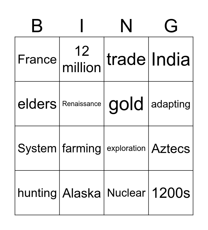This bingo card has 16 words: Alaska, Aztecs, trade, France, System, 12 million, exploration, Nuclear, elders, Renaissance, hunting, India, farming, adapting, gold and 1200s.