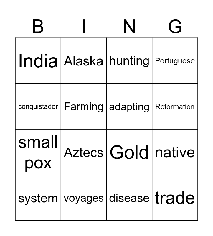 This bingo card has 16 words: voyages, native, hunting, India, small pox, Alaska, Gold, disease, conquistador, Farming, system, Portuguese, Aztecs, Reformation, adapting and trade.