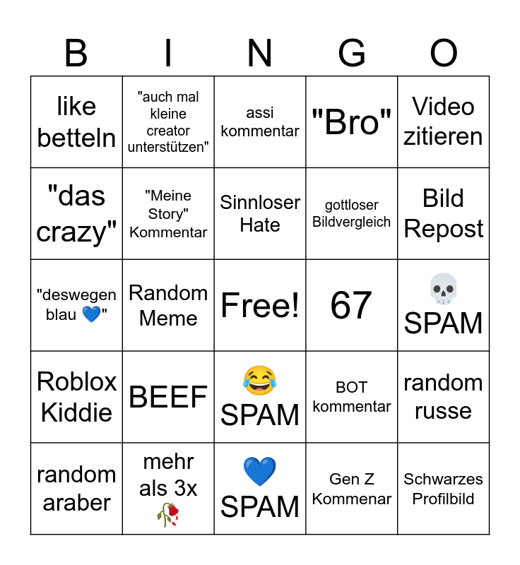 This bingo card has a free space and 24 words: BEEF, mehr als 3x 🥀, Sinnloser Hate, random araber, Video zitieren, like betteln, "das crazy", "auch mal kleine creator unterstützen", 67, 😂 SPAM, gottloser Bildvergleich, "deswegen blau 💙", BOT kommentar, random russe, "Meine Story" Kommentar, Gen Z Kommenar, 💀 SPAM, assi kommentar, Bild Repost, Random Meme, Schwarzes Profilbild, Roblox Kiddie, "Bro" and 💙SPAM.