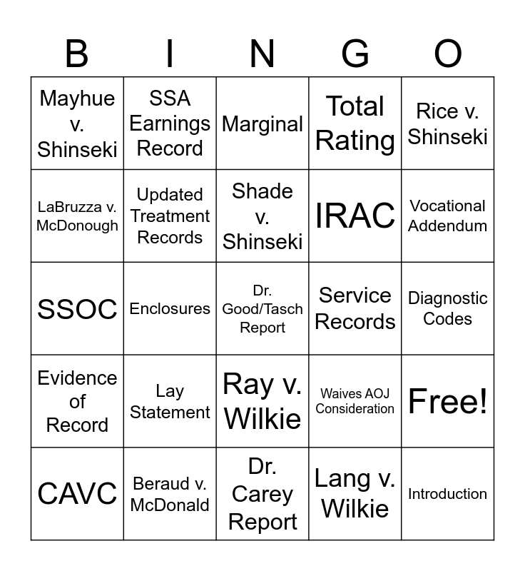 This bingo card has 26 words: Ray v. Wilkie, Lang v. Wilkie, Shade v. Shinseki, Beraud v. McDonald, Rice v. Shinseki, Mayhue v. Shinseki, LaBruzza v. McDonough, SSA Earnings Record, Diagnostic Codes, Waives AOJ Consideration, IRAC, SSOC, Free!, CAVC, Enclosures, Expert Reports, Total Rating, Evidence of Record, Marginal, Dr. Good/Tasch Report, Vocational Addendum, Dr. Carey Report, Service Records, Lay Statement, Updated Treatment Records and Introduction.