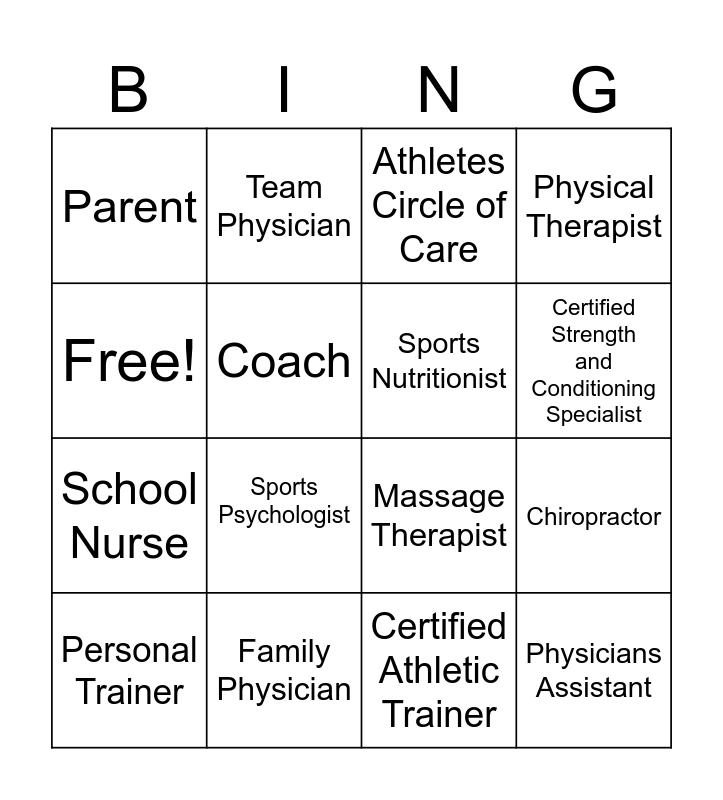 This bingo card has 16 words: Family Physician, Chiropractor, Athletes Circle of Care, Parent, School Nurse, Team Physician, Massage Therapist, Certified Athletic Trainer, Free!, Coach, Personal Trainer, Physical Therapist, Sports Psychologist, Certified Strength and Conditioning Specialist, Sports Nutritionist and Physicians Assistant.