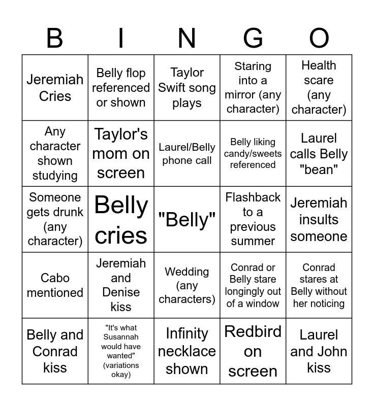 This bingo card has a free space and 29 words: Belly and Conrad kiss, Benito's Grandma mentioned, Belly cries, Conrad Cries, Jeremiah Cries, Taylor Swift song plays, Taylor's mom on screen, Jeremiah and Denise kiss, Flashback to a previous summer, "It's what Susannah would have wanted" (variations okay), Jeremiah insults someone, Laurel and John kiss, Infinity necklace shown, Redbird on screen, Laurel calls Belly "bean", Taylor and Steven PDA, Wedding (any characters), Cabo mentioned, Health scare (any character), Someone gets drunk (any character), Conrad or Belly stare longingly out of a window, Red Jeep on screen, Belly liking candy/sweets referenced, Any character shown studying, Staring into a mirror (any character), Belly flop referenced or shown, Conrad stares at Belly without her noticing, Laurel/Belly phone call and Hydrangeas shown.