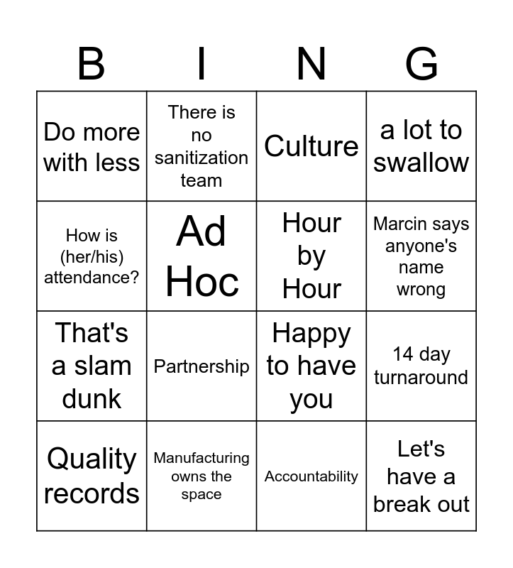 This bingo card has 17 words: Accountability, Quality records, Culture, Do more with less, Partnership, a lot to swallow, 14 day turnaround, Hour by Hour, Marcin says anyone's name wrong, Ad Hoc, Manufacturing owns the space, Happy to have you, How is (her/his) attendance?, There is no sanitization team, That's a slam dunk, Anyone mentions SIOP and Let's have a break out.