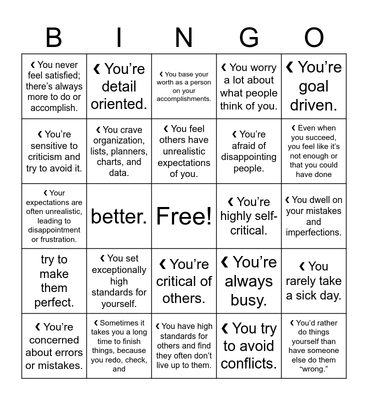 This bingo card has a free space and 25 words: You set exceptionally high standards for yourself., You have high standards for others and find they often don’t live up to them., You feel others have unrealistic expectations of you., You’re concerned about errors or mistakes., You’re goal driven., You never feel satisfied; there’s always more to do or accomplish., You’re sensitive to criticism and try to avoid it., You’re detail oriented., You’re highly self-critical., You’re critical of others., You’re afraid of disappointing people., Your expectations are often unrealistic, leading to disappointment or frustration., You’re always busy., You rarely take a sick day., You crave organization, lists, planners, charts, and data., You try to avoid making mistakes, and you see them as bad., You dwell on your mistakes and imperfections., You base your worth as a person on your accomplishments., Even when you succeed, you feel like it’s not enough or that you could have done, better., You’d rather do things yourself than have someone else do them “wrong.”, Sometimes it takes you a long time to finish things, because you redo, check, and, try to make them perfect., You worry a lot about what people think of you. and You try to avoid conflicts..