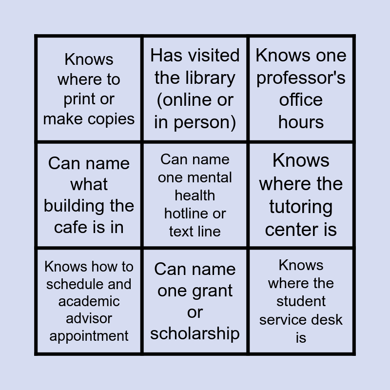 This bingo card has a free space and 8 words: Knows where the tutoring center is, Knows one professor's office hours, Has visited the library (online or in person), Knows how to schedule and academic advisor appointment, Knows where to print or make copies, Knows where the student service desk is, Can name what building the cafe is in and Can name one grant or scholarship.