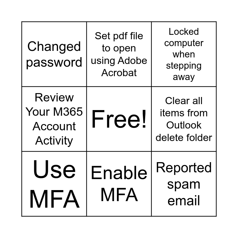 This bingo card has a free space and 15 words: Clear browser cookies, Reported phishing email, Locked computer when stepping away, Changed password, Enable MFA, Reported spam email, Check if computer is secure with SentinelOne, Show and hide favorites/ bookmarks, Clear all items from Outlook delete folder, Check if their one drive is accessible on the file explorer, Locate the All Forms folder in CAPnet, Review Your M365 Account Activity, Use MFA, Set pdf file to open using Adobe Acrobat and Use Microsoft OneDrive.