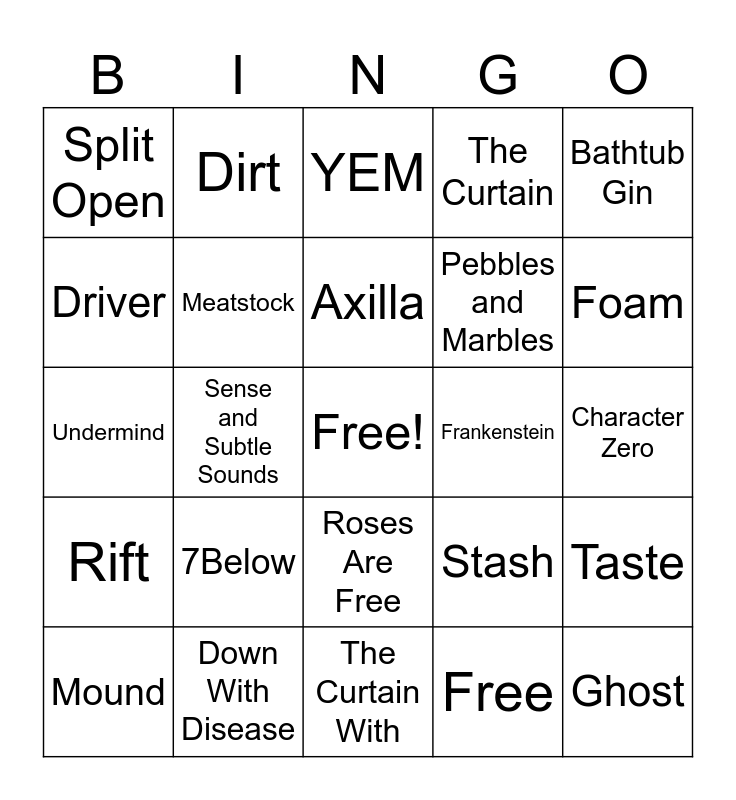 This bingo card has a free space and 24 words: 7Below, Down With Disease, Axilla, Mound, Bathtub Gin, Split Open, Driver, Dirt, Frankenstein, Roses Are Free, Pebbles and Marbles, Undermind, Stash, Taste, Meatstock, Free, Character Zero, YEM, Foam, Sense and Subtle Sounds, Ghost, Rift, The Curtain and The Curtain With.
