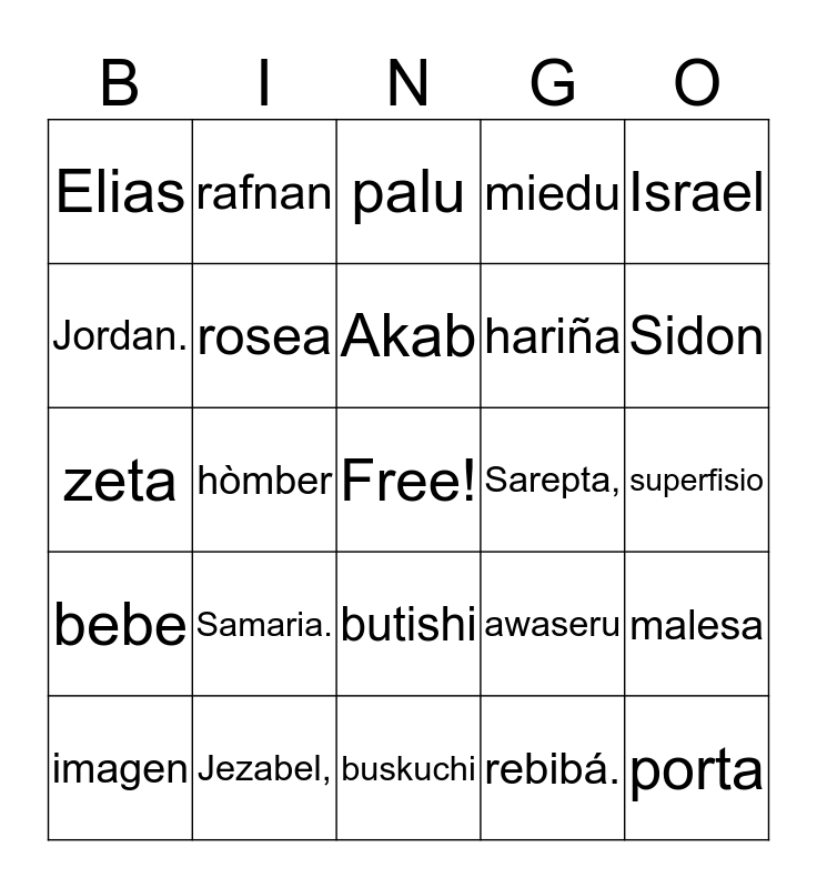 This bingo card has a free space and 24 words: Samaria., Jezabel,, Akab, imagen, Israel, Elias, Jordan., rafnan, Sarepta,, butishi, hariña, zeta, awaseru, malesa, rosea, rebibá., superfisio, palu, Sidon, hòmber, porta, bebe, miedu and buskuchi.