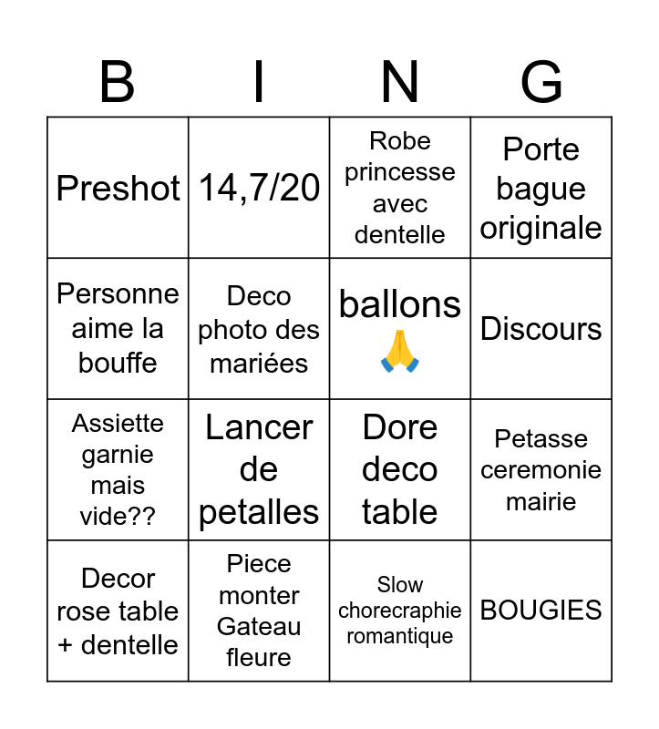 This bingo card has 16 words: Decor rose table + dentelle, Piece monter Gateau fleure, Robe princesse avec dentelle, Porte bague originale, Personne aime la bouffe, 14,7/20, Dore deco table, Petasse ceremonie mairie, Preshot, Deco photo des mariées, Slow chorecraphie romantique, Discours, Assiette garnie mais vide??, Lancer de petalles, ballons 🙏 and BOUGIES.
