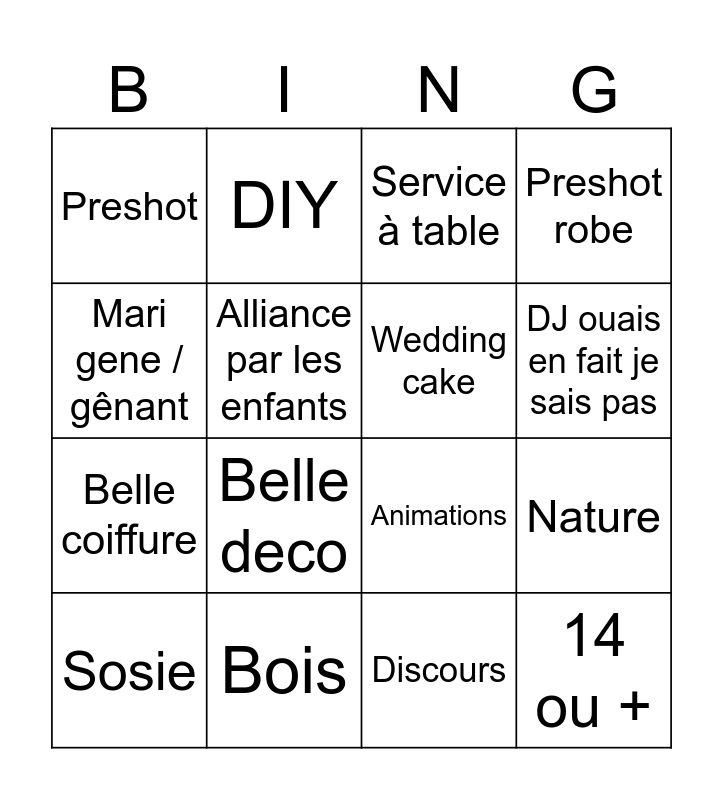 This bingo card has 16 words: Bois, Nature, Service à table, Preshot, Belle coiffure, DIY, Animations, Discours, Mari gene / gênant, Alliance par les enfants, Sosie, Preshot robe, Belle deco, DJ ouais en fait je sais pas, Wedding cake and 14 ou +.