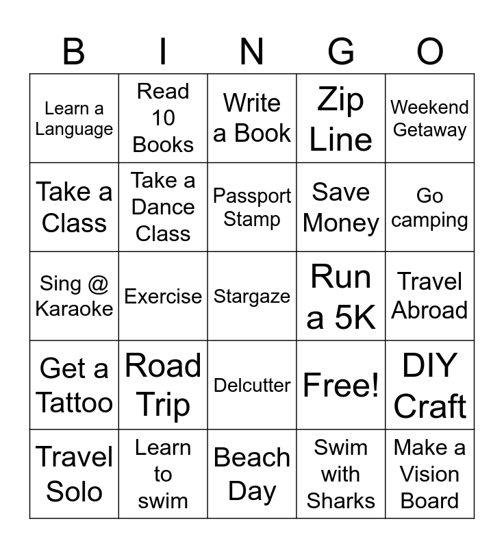 This bingo card has 25 words: Road Trip, Beach Day, Passport Stamp, Travel Solo, Weekend Getaway, Learn a Language, Take a Class, Read 10 Books, Run a 5K, Delcutter, Save Money, Sing @ Karaoke, Free!, DIY Craft, Take a Dance Class, Make a Vision Board, Travel Abroad, Write a Book, Go camping, Exercise, Stargaze, Learn to swim, Get a Tattoo, Zip Line and Swim with Sharks.