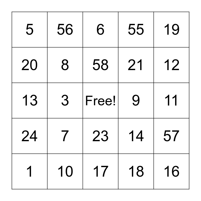 This bingo card has a free space and 29 words: 1, 2, 3, 4, 5, 6, 8, 7, 9, 10, 11, 16, 17, 18, 12, 15, 23, 24, 19, 13, 14, 22, 21, 20, 55, 56, 57, 58 and 59.