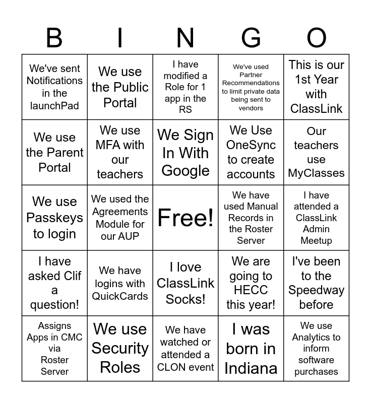 This bingo card has a free space and 24 words: We have logins with QuickCards, We use Security Roles, We Sign In With Google, Assigns Apps in CMC via Roster Server, This is our 1st Year with ClassLink, We've sent Notifications in the launchPad, We use the Parent Portal, We use the Public Portal, We have used Manual Records in the Roster Server, I love ClassLink Socks!, We Use OneSync to create accounts, We use Passkeys to login, We are going to HECC this year!, I've been to the Speedway before, We use MFA with our teachers, I was born in Indiana, I have attended a ClassLink Admin Meetup, I have modified a Role for 1 app in the RS, Our teachers use MyClasses, We used the Agreements Module for our AUP, We use Analytics to inform software purchases, I have asked Clif a question!, We've used Partner Recommendations to limit private data being sent to vendors and We have watched or attended a CLON event.