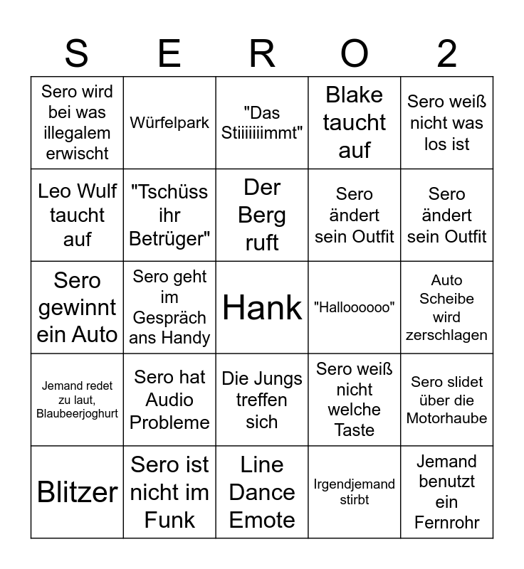 This bingo card has 43 words: Sero wird von der Polizei angehalten, Hank, Jemand bekommt Kopfschmerzen, Blitzer, Sero Stirbt, Irgendjemand stirbt, "Das Stiiiiiiimmt", "X-Muskel", Sero weiß nicht was los ist, Sero ist nicht im Funk, Blake taucht auf, "Halloooooo", Die Jungs treffen sich, Sero hat Audio Probleme, Backflip Emote, Line Dance Emote, Sero geht ins Casino, Sero gewinnt ein Auto, Sero boxt in die Luft, Sero ändert sein Outfit, Würfelpark, Würfelpark Gangster, Sero macht peak RP, Sero wird bei was illegalem erwischt, Sero baut einen Unfall, Auto Scheibe wird zerschlagen, "Das ist Privatsache", Donnie taucht auf, Sero weiß nicht welche Taste, Jemand redet zu laut, Blaubeerjoghurt, Der Berg fordert ein Opfer, Sero slidet über die Motorhaube, Sero macht random Aktionen, Sero geht im Gespräch ans Handy, Donnie und Blake werden verwechselt, Buch RP, Jemand benutzt ein Fernrohr, Der Berg ruft, Leo Wulf taucht auf, Sero ändert sein Outfit, Jemand beschwert sich über Seros Fahrkünste, "Tschüss ihr Betrüger" and Free.