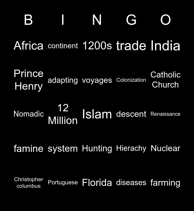 This bingo card has a free space and 24 words: system, Portuguese, voyages, Christopher columbus, India, Africa, Prince Henry, continent, descent, Hunting, Colonization, Nomadic, Hierachy, Nuclear, adapting, diseases, Renaissance, 1200s, Catholic Church, 12 Million, farming, famine, trade and Florida.