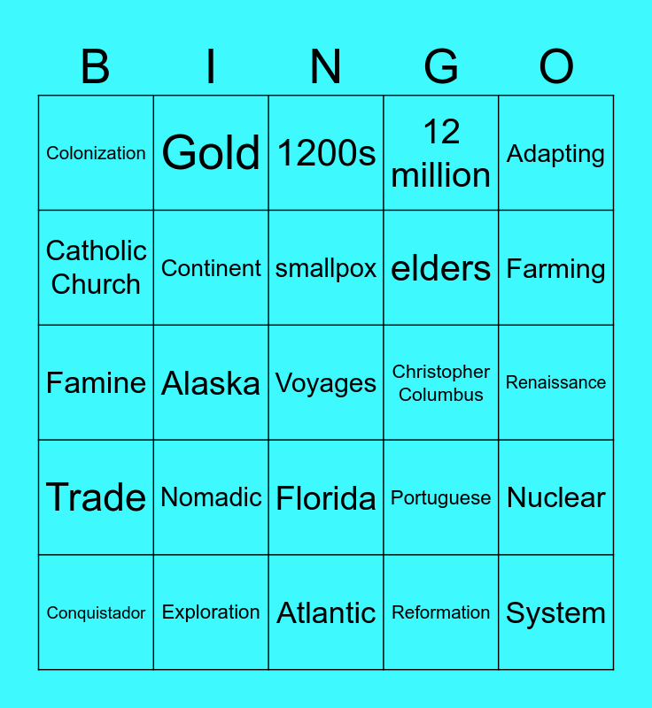 This bingo card has a free space and 24 words: Nomadic, Exploration, smallpox, Conquistador, Adapting, Colonization, Catholic Church, Gold, Christopher Columbus, Florida, elders, Famine, Portuguese, Nuclear, Continent, Reformation, Renaissance, 1200s, Farming, Alaska, System, Trade, 12 million and Atlantic.