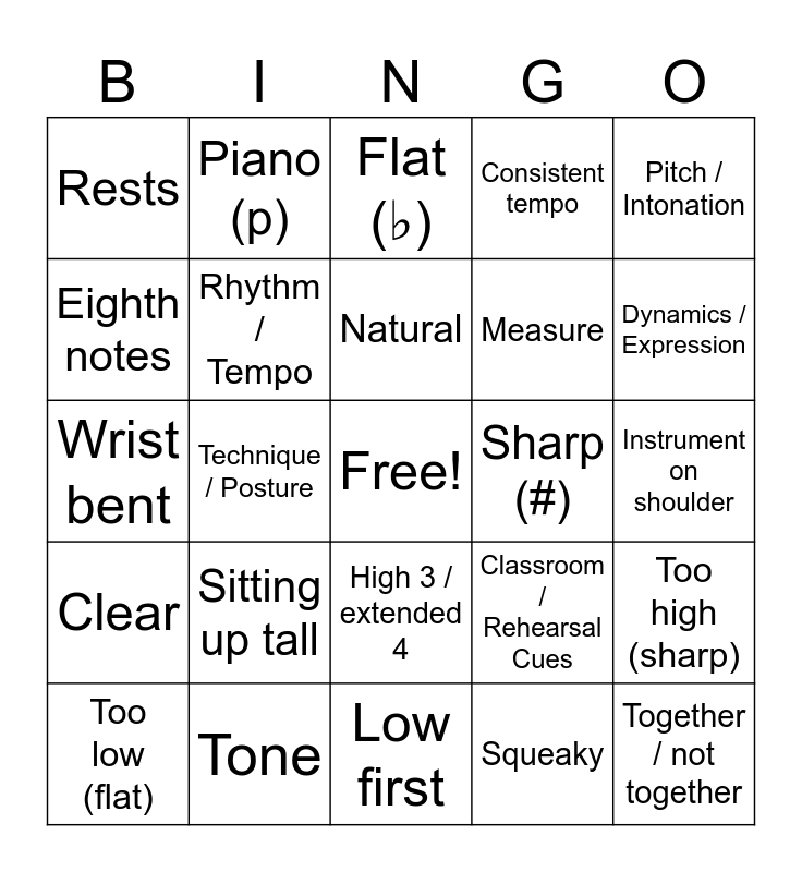 This bingo card has a free space and 59 words: Tone / Sound Quality, Tone, Scratchy, Clear, Squeaky, Warm, Rhythm / Tempo, Rhythm, Measure, Tempo, Consistent tempo, Tempo sped up / slowed down, Eighth notes, Quarter notes, Half notes, Rests, Together / not together, Pitch / Intonation, Intonation, Natural, Sharp (#), Flat (♭), Too low (flat), Too high (sharp), Matched / didn’t match, Intonation check by holding note, C#, F#, Dynamics / Expression, Dynamics, Loud / soft, Crescendo, Decrescendo, Forte (f), Piano (p), Accent, Made me feel / didn’t make me feel, Technique / Posture, Posture, Wrist bent, Feet on the ground, Sitting up tall, Instrument on shoulder, Bow hand, Thumb bent / not bent, Pointer finger placement, Pitch Relationships / Fingerings, Low second, High 3 / extended 4, Low first, Half step, Whole step, Sections / Instruments, Section (violas, 2nd violins, 1st violins, cellos, basses), Section too loud / too quiet, Classroom / Rehearsal Cues, Starting measure, Play by themselves (sectionals) and Pencil on your stand.