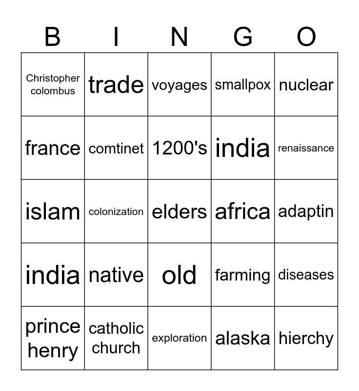 This bingo card has a free space and 24 words: native, catholic church, 1200's, prince henry, nuclear, Christopher colombus, france, trade, africa, old, india, islam, farming, diseases, comtinet, alaska, adaptin, voyages, renaissance, colonization, hierchy, india, smallpox and exploration.