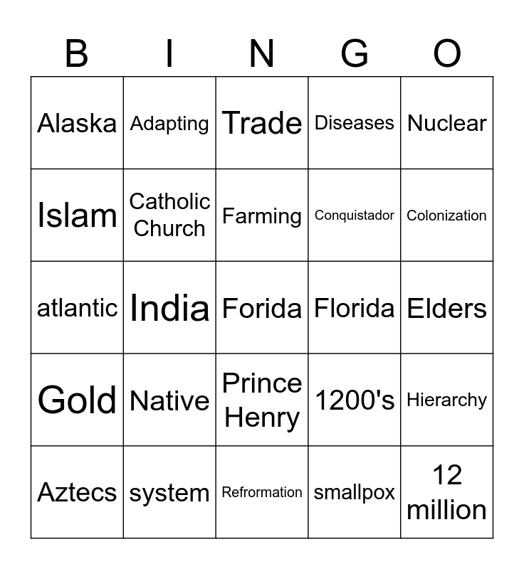 This bingo card has a free space and 24 words: Native, system, Farming, Aztecs, Nuclear, Alaska, Islam, Adapting, Florida, Prince Henry, Conquistador, atlantic, 1200's, Hierarchy, Catholic Church, smallpox, Elders, Trade, Colonization, India, 12 million, Gold, Diseases and Refrormation.