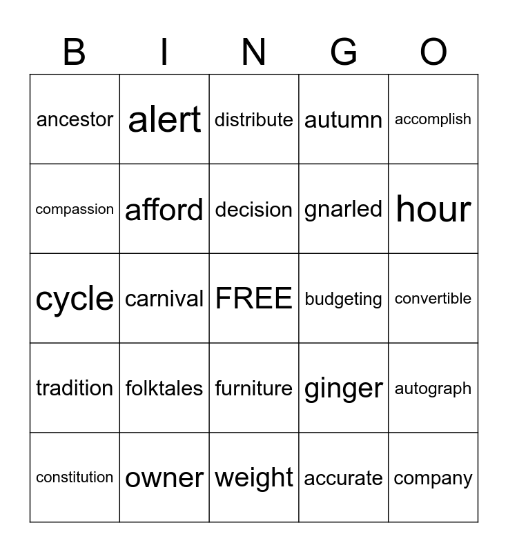 This bingo card has a free space and 24 words: folktales, owner, decision, constitution, accomplish, ancestor, compassion, alert, budgeting, furniture, gnarled, cycle, ginger, autograph, afford, accurate, convertible, distribute, hour, carnival, company, tradition, autumn and weight.