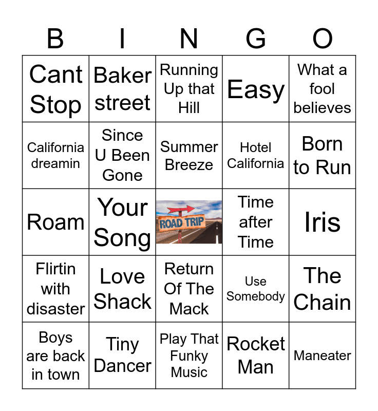 This bingo card has 1 images and 39 words: Dreams, Roam, Buddy Holly, Since U Been Gone, Tiny Dancer, Return Of The Mack, Summer Breeze, I wanna Dance wit somebody, What a fool believes, Flirtin with disaster, Your Song, Easy, Iris, Time after Time, Love Shack, Rosanna, Cant Stop, Baba Oreilly, Running Up that Hill, The Chain, Rocket Man, Hotel California, California dreamin, Everybody want to rule the world, Escape, Hey Ya, Heroes, Maneater, Imagine, Just a Girl, Boys are back in town, Im Good(Blue), Use Somebody, Born to Run, Play That Funky Music, Radar Love, A Thousand Miles From Nowhere, Baker street and I wish.